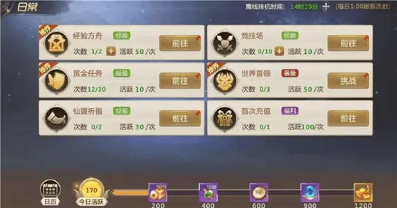 每天可接取20环日常任务,日常任务的难度较小,只要在游戏中击杀与自身等级差不多的怪物就能获取到一定的奖励,而在打日常任务前,大家千万要记得提升日常任务的星级,星级越高,奖励就越高,如满星为10星,满星的奖励为经验36万,铜钱12540点,要远远超过其他星级奖励,所以大家不要心疼提升星级花费的那点小钱,效果很佳,在游戏前期,日常任务属于最好的练级方式,且在游戏中完成1环任务,可使用10元宝,全部完成需花费100元宝,但必须是VIP等级在3级以上的玩家才有这样的特权。