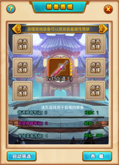星级装备只能吞噬星级装备:吞噬不同星级的装备会增加不同的经验值,注意:低星吞噬高星不能继承高星(比如:1星吞噬5星,只会增加5星提供的经验,而不是直接变为5星)