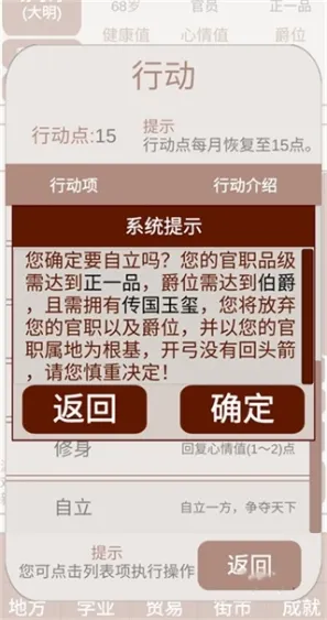 明朝人生养成记2内置修改器版本通过文字剧情的方式进行,玩家在游戏开始时会随机扮演平民、商人、官员等不同角色。你需在明朝人生养成记2内置修改器最新版中根据所选的身份设定来进行体验,从而让你的人生变得与众不同。