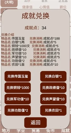 娶妻纳妾费用都是1000文,妻子同龄人,妾进门18岁,年龄影响怀孕几率,点开妻妾选传承,玩家降低2点健康值,妻妾有几率怀孕,女儿不能继承家业续命,目测草屋95%概率生女儿,砖屋85%生儿子,房屋升级需要先在街市的钱庄购买兑换券,把铜钱换成银子,然后家族-资产-升级房屋,银铜汇率会在大约950~1050文之间波动。