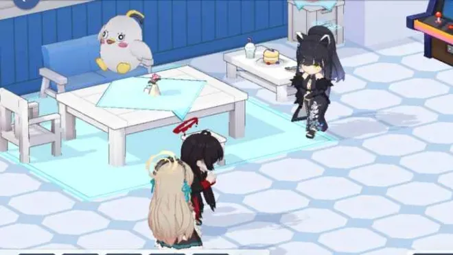 通过点击摸头前来参观咖啡厅的已有学生,可以增加与学生的好感,前来参观的学生数量会根据咖啡厅的舒适度而增加,所以还请各位老师合理安排咖啡厅的家具布置。