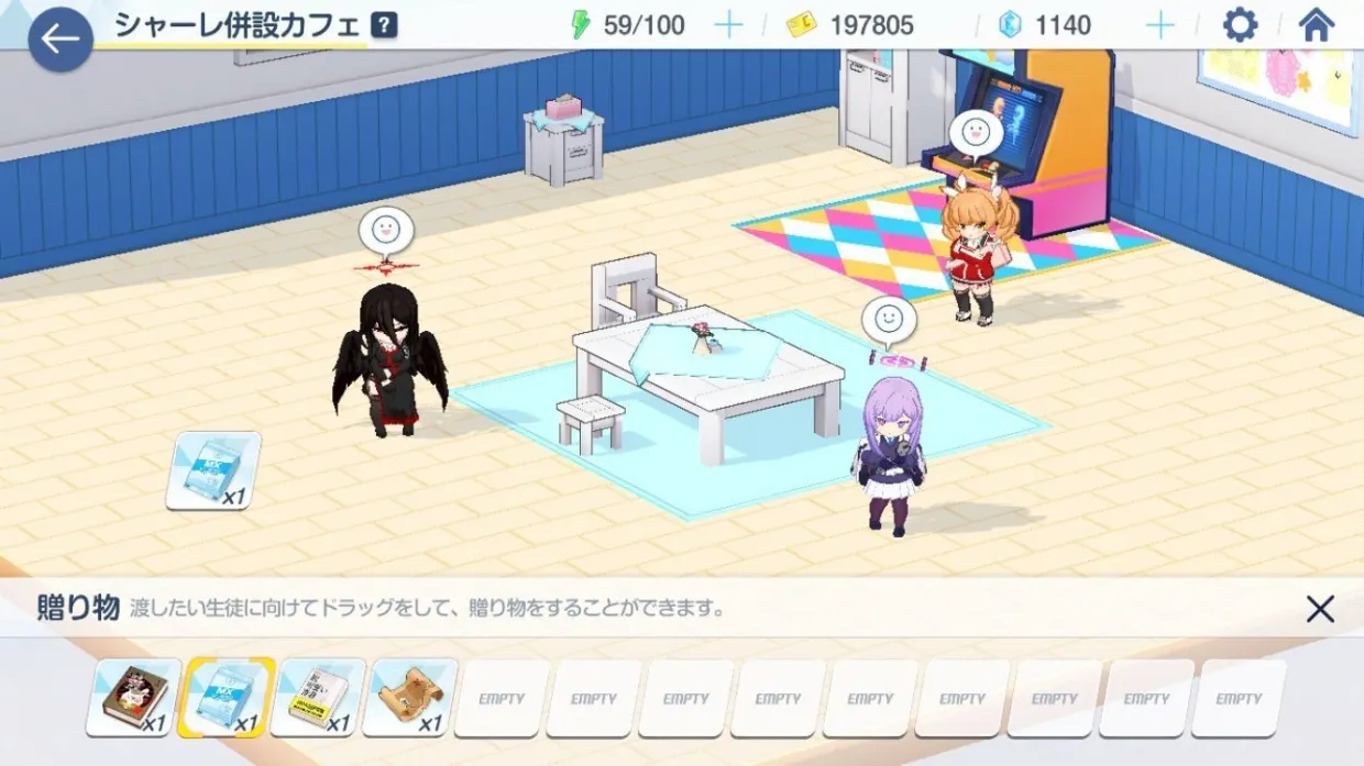 当学生来到我们的咖啡厅的时候我们也可以通过赠送礼物来提升好感,但是每个角色都有自己喜欢的礼物,当我们赠送学生喜欢的礼物的时候,增加的好感将会大大高于普通的礼物。