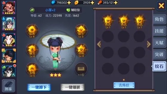 工欲善其事,必先利其器,纹石就是这样提升战力必不可少的神器。纹石属性多种多样,装备之后对玩家的属性加成也各有功效,例如猛虎可以增加攻击力、飞仙增加初始灵力、迅狐则能提升闪避概率。游戏中共有六位神秘炼纹师可以帮助玩家进行炼纹,根据炼纹师的水平,纹石可以分为绿、蓝、紫、金四种品质,品质越高加成效果也更高。不过每位炼纹师水平各不相同,想要请到他们的代价自然也是不同。好在如果练出低品质纹石也不用着急,可以使用合成技能提升它们的等级,增强效果。战场上装备纹石,对战起来如虎添翼哦~
