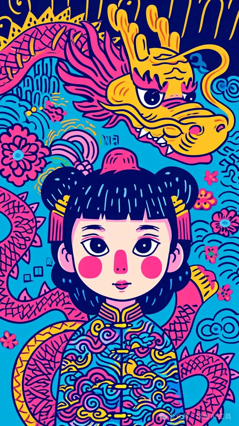 例:在输入框中输入【五彩斑斓,龙,扁平插画,点擦,多彩,chibi,Henry Matisse】,即可生成下图。