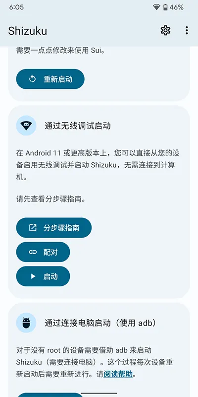 1、设备重新启动后需要再次打开“无线调试”选项并重新启动 Shizuku。