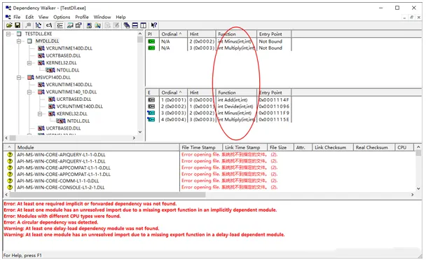 如果将MyDll中的函数int Minus(int, int)删除,重新生成MyDll.dll,然后再次查看TestDll.exe的依赖关系,显示如下: