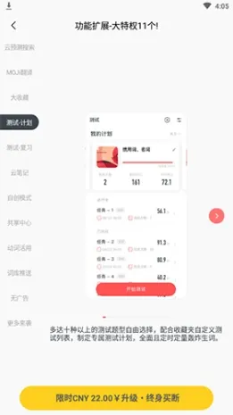 ● 多达十种以上的测试题型自由选择,配合收藏夹自定义测试列表,制定专属测试计划,全面且定时定量轰炸生词。