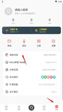 1、打开软件,点击底端的“我的”按钮,然后点击“我的词库”选项。