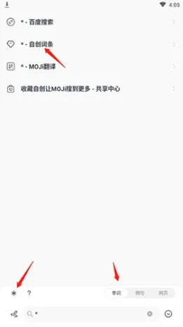 2、点击底端的“单词”选项与“*”按钮,然后点击“自创词条”选项即可。
