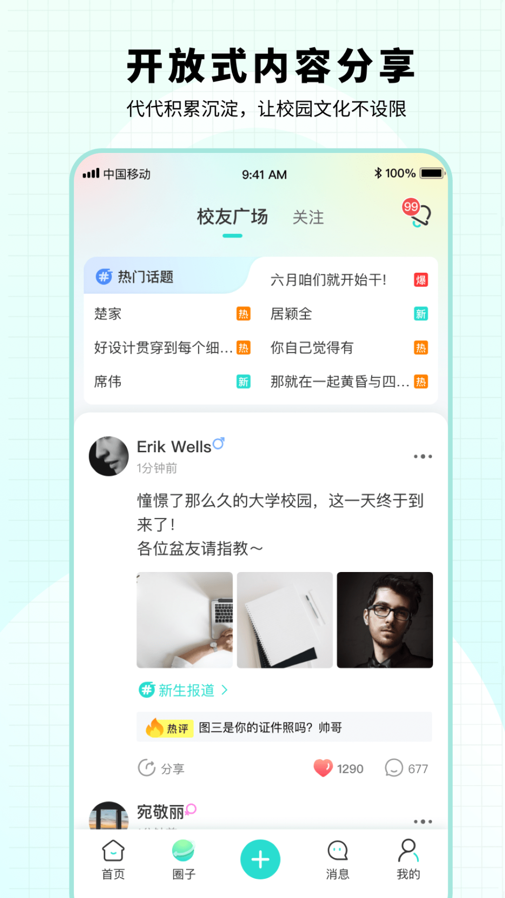 2、校友广场 - 全校范围内开放式内容分享,聚焦扁平化校园文明,疏通校友交流渠道。