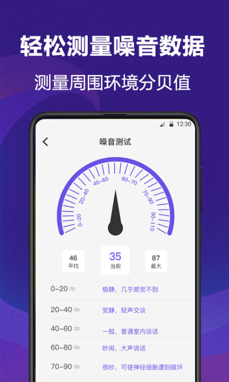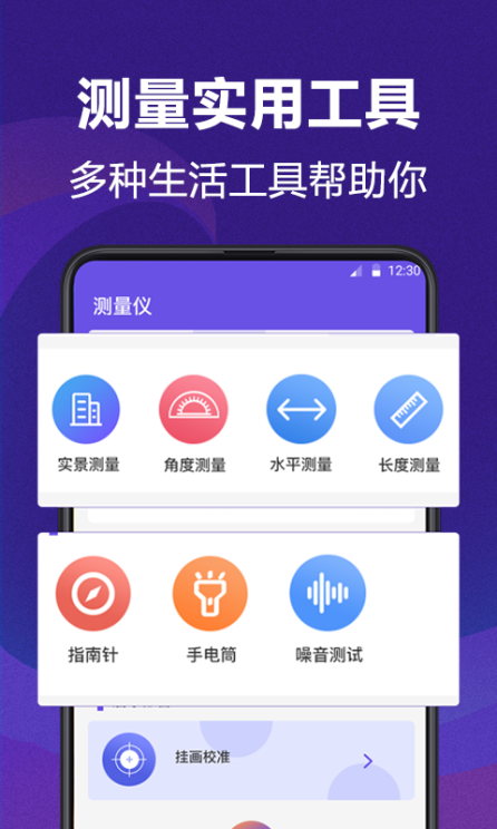 【多功能测量工具】智能测量尺子,只需三步即可轻松测量物体高度:首先输入身高,然后将设备的靶心分别对准物体底部和顶部并按下按钮,即可完成实景物体高度测量。此外,它还具备直尺刻度、水平仪和量角器等功能,帮助您轻松完成各种测量任务。 【噪音测试】通过手机即可快速检测室内噪音分贝,让您随时了解所处环境的噪音状况。无论是检查家中的加湿器还是办公室的噪音,只需打开手机就能轻松完成。 【挂画校准】使用该工具挂画变得简单快捷。只需将虚线与画框顶部对齐,移动画框直至对齐,即可确保挂画完全水平。 【户外助手】手机中的指南针、手电筒等功能成为您的户外好帮手,无论是徒步探险、定向越野、溯溪登山、露营活动还是极限运动,只需打开手机,即可应对各种户外挑战。