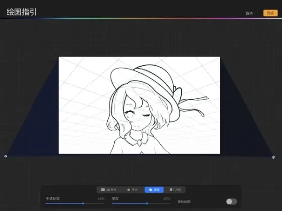 「绘图指引」能够设置成多种不同形式的辅助线网线,除了普通的平行网格外,还有等边三角型格线、透视线、对称轴线。在图层操作菜单中开启「绘图辅助」后,在该图层绘图时画笔的走向会自动按照网格方向进行。