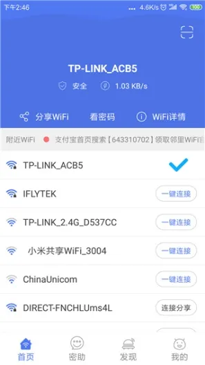 在“发现”功能中,用户可以看到其他用户分享的WiFi网络和密码。用户可以根据自己的需求搜索并连接这些网络,享受免费上网服务。