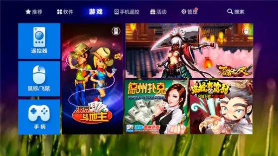 主要有装机必备,电视直播,视频聚合,遥控游戏,手柄游戏,亲子互动,儿歌故事,幼儿教育。