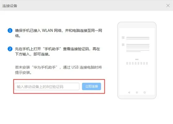 先在手机上打开“手机助手”查看连接验证码,再在下方输入,即可连接。若未安装“华为手机助手”,通过USB连接电脑时将提示安装;