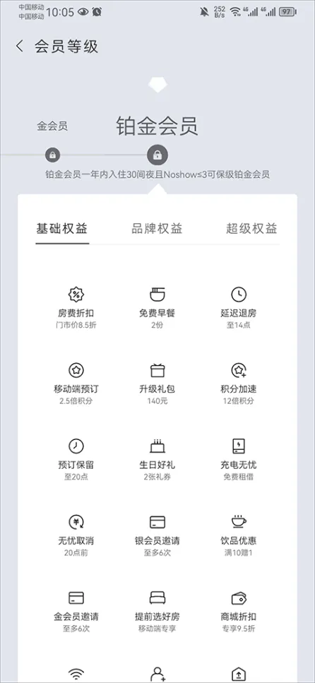 1、升级铂金会员需要一年内入住30间夜且Noshow≤3可保级铂金会员