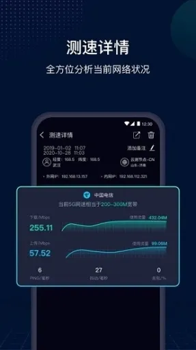 一键精准测试Wi-Fi、4G、5G和宽带速度,提供下载速度、上传速度、延时、丢包、抖动数据 ;