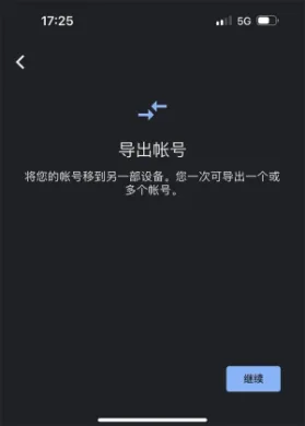 在手机上打开“Authenticator”应用,点击右上角菜单并选择“导出账号”,可以将 谷歌身份验证器 的信息迁移到另一台设备。