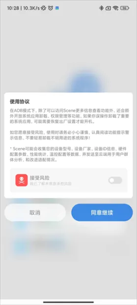 启动Scene工具箱程序,点击图示的“ADB模式”,在出现的警告窗口中确认同意,随后即可访问Scene5的主要界面,查看各类软硬件详情。