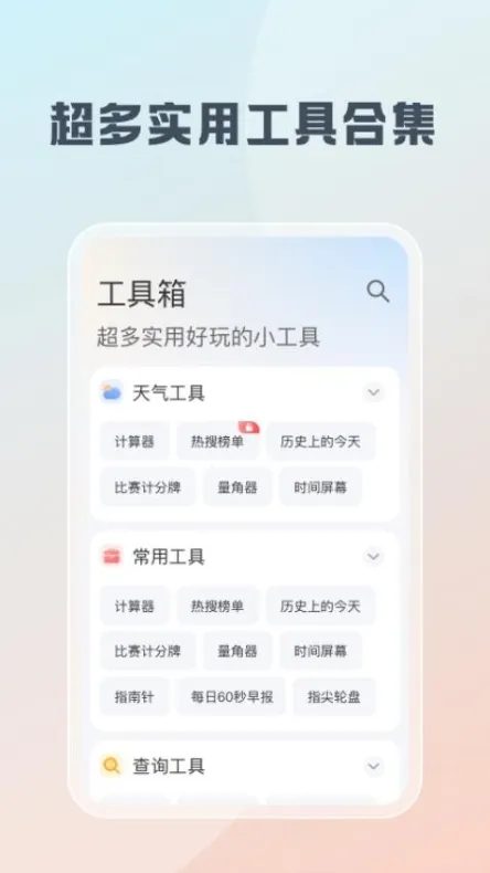 随身工具箱APP是一款提供多种实用工具的软件,您可以在这里迅速获得许多工具,比如:图片编辑、计算器、天气预报、赛事计分、量角器等。用户可以在日常生活和工作中根据个人需求使用各类工具,从而帮助您高效解决问题,减少困扰。随身工具箱官方版还提供了辅助决策的工具,您今后可以通过平台上的抛硬币、转盘、小决定等方式快速做出选择,这有助于缓解选择困难。平台将持续更新更多工具,有需要的用户快来下载吧!