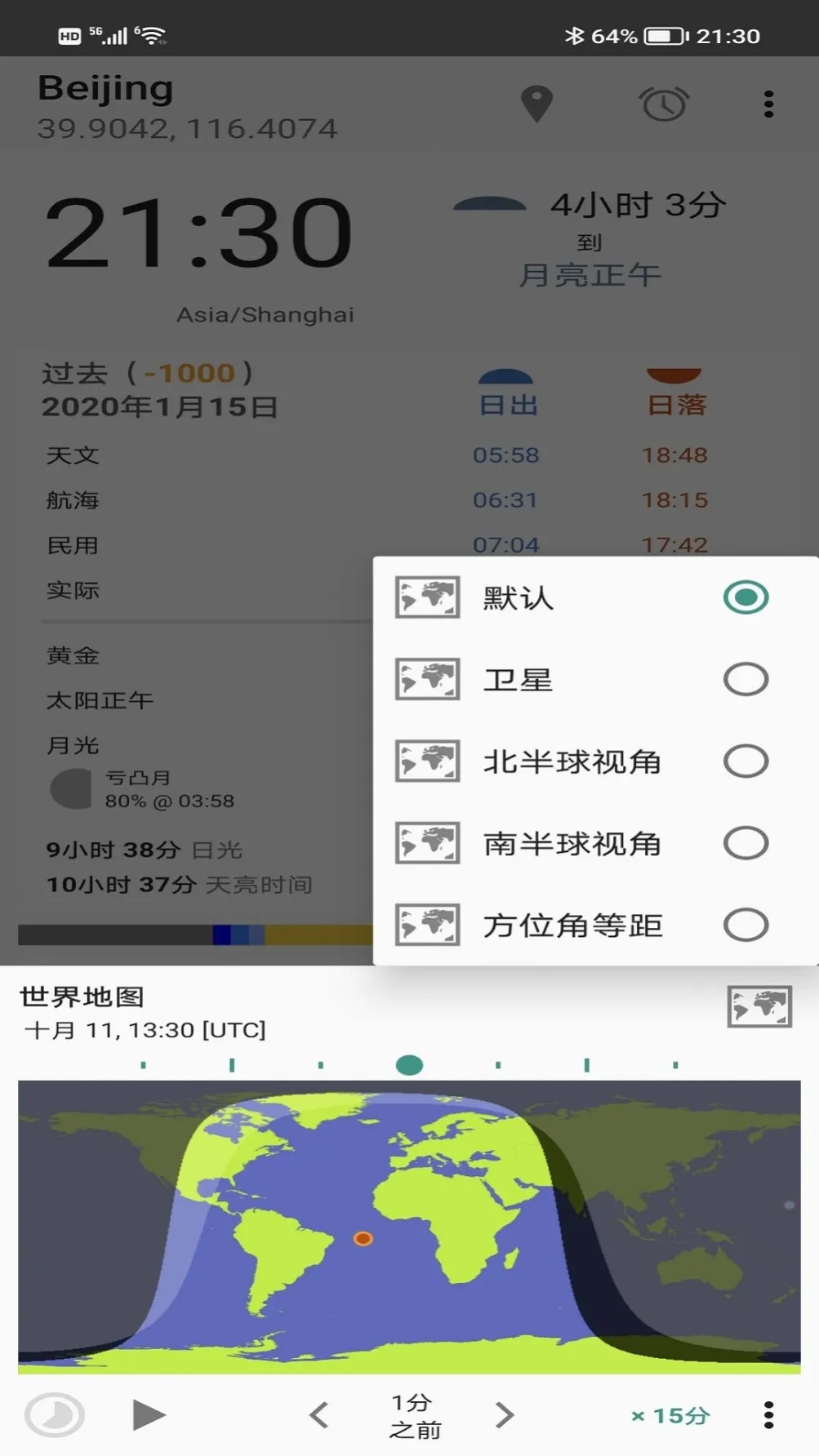 启动软件后,您可以查看日出和日落的时间,并设置表盘样式以获得不同的显示效果。此外,您还可以切换卫星视图和北半球视角,以及调整方位角等设置。