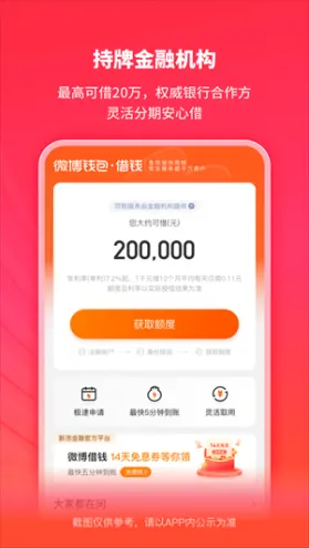 额度灵活:各种额度轻松借,最高可借200000元,满足各种贷款需求